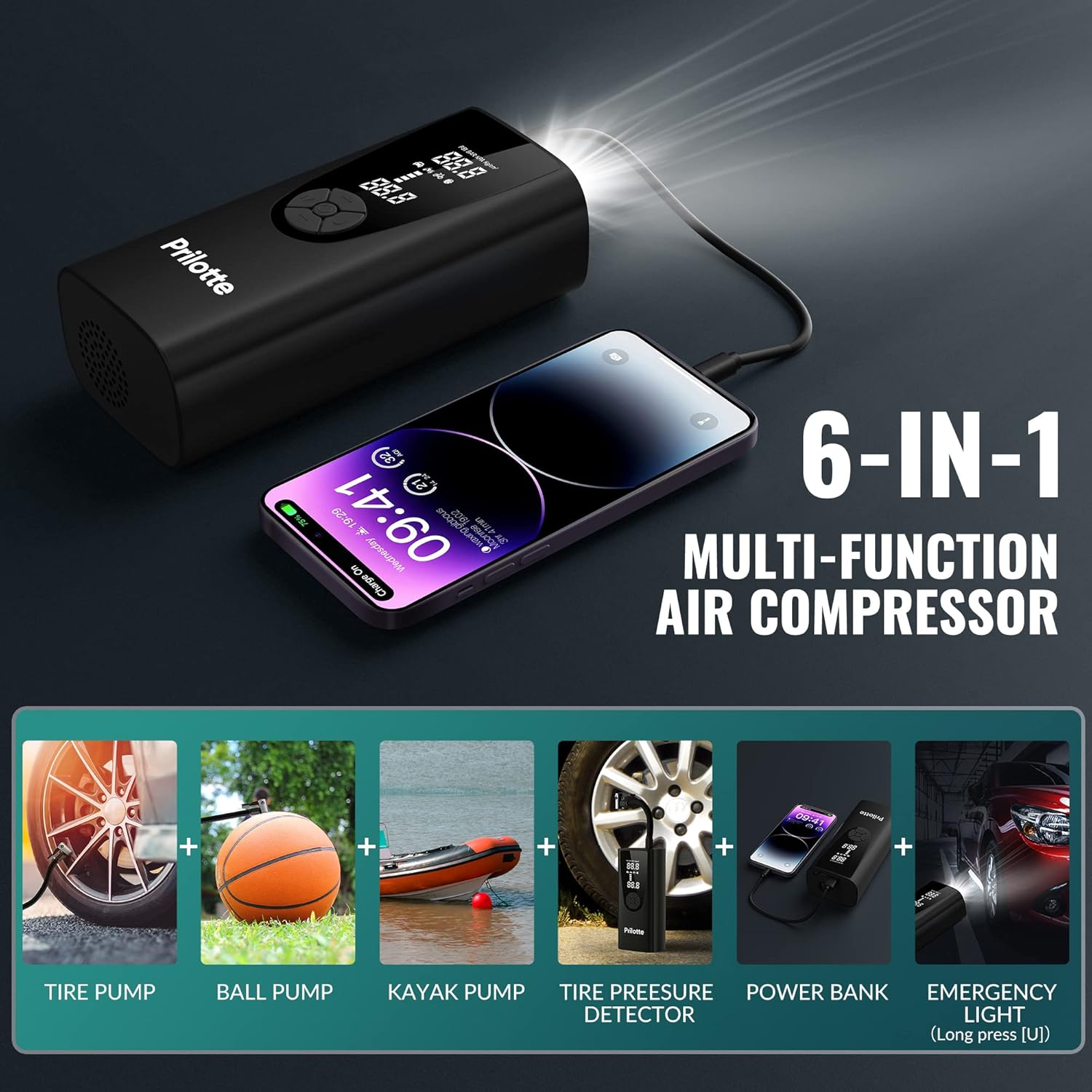 Imagina la tranquilidad de viajar sabiendo que llevas contigo un dispositivo pequeño pero potente que no solo infla neumáticos hasta 150 PSI, sino que también carga tu celular gracias a su función de power bank. Una herramienta práctica y multifuncional que cuida de ti y de tu vehículo.